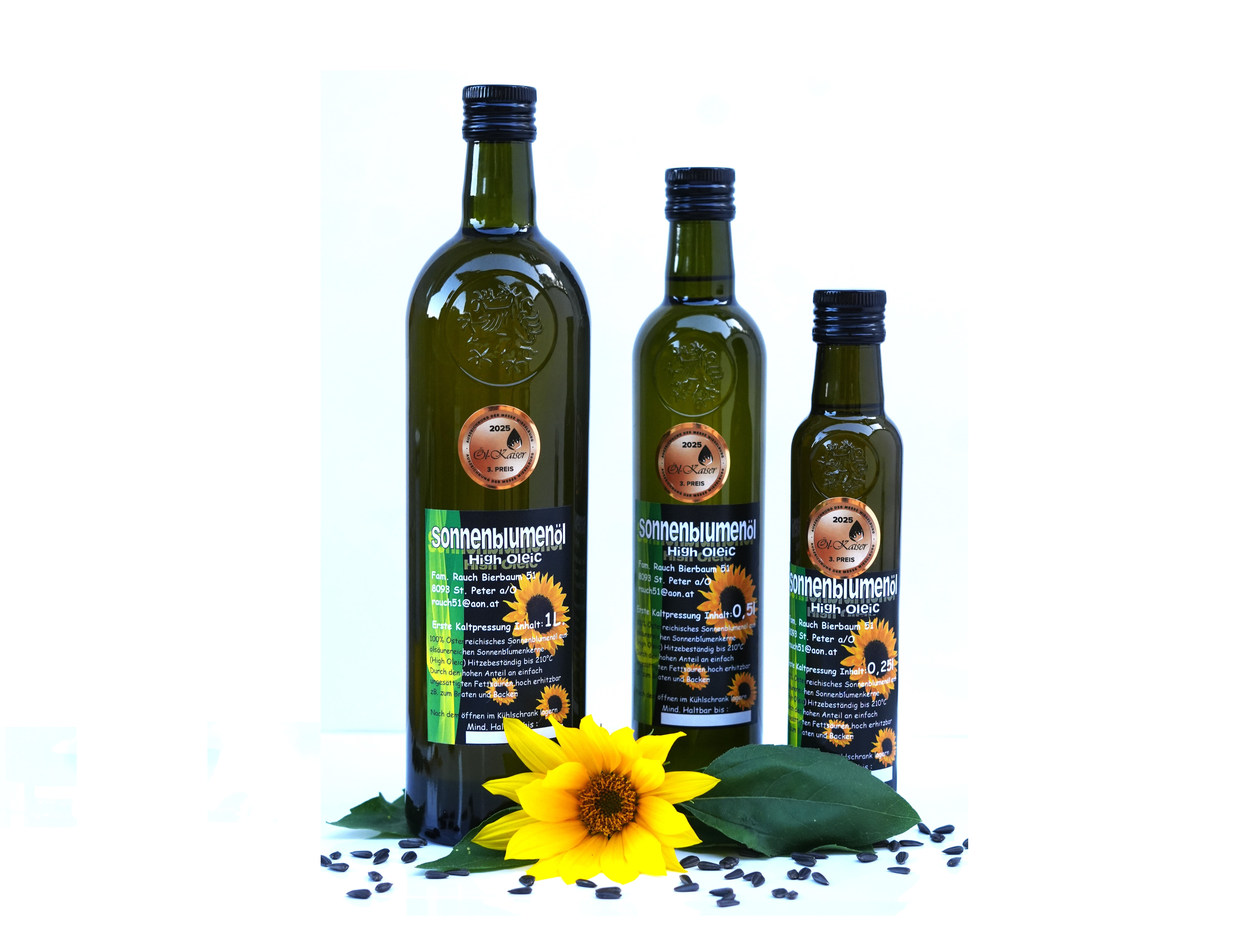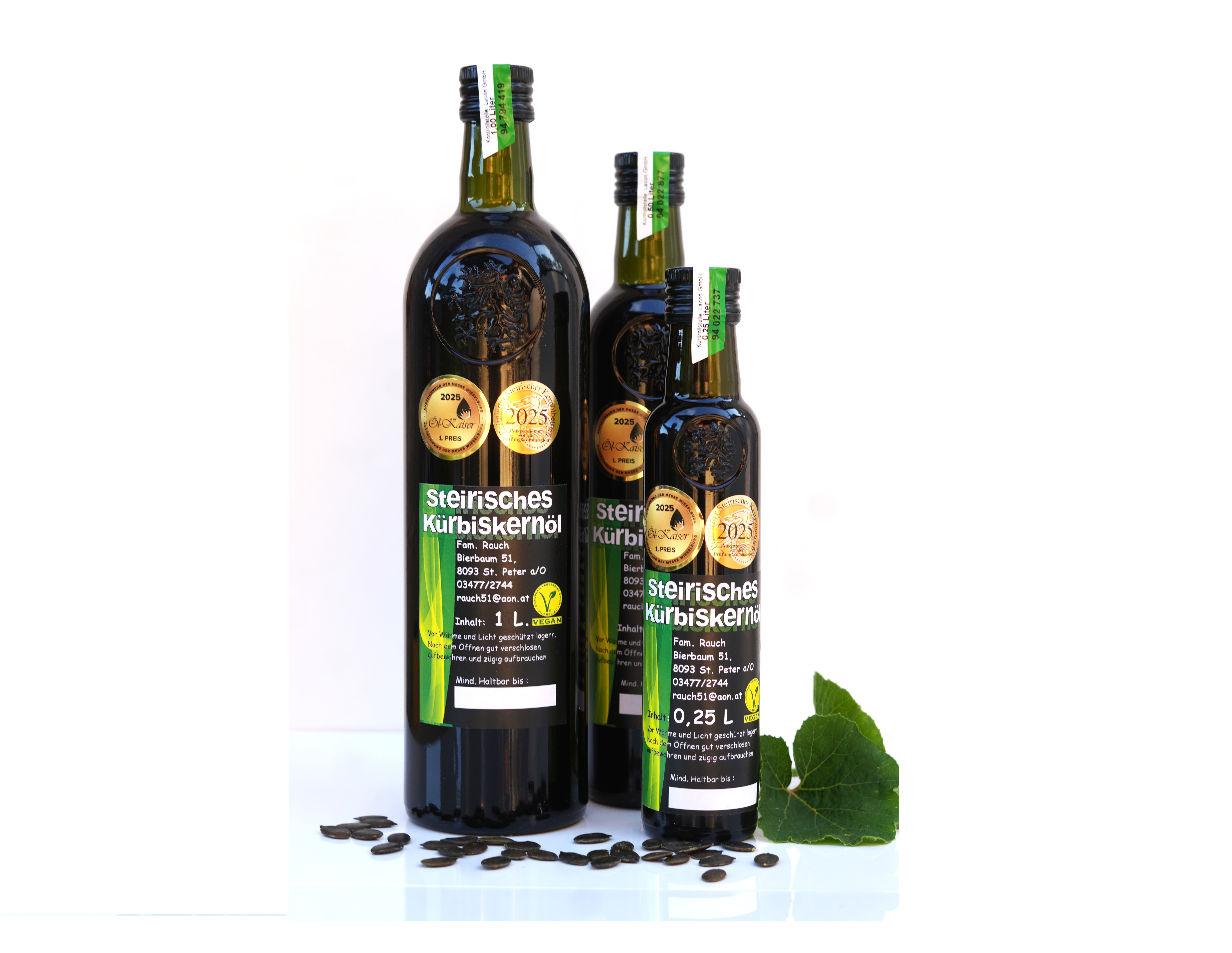 Unser Betrieb verfügt auch über eine Kürbiskernöl-Lohnpresse wo wir unser hauseigenes Kürbiskernöl herstellen. Wir verarbeiten auch die Kerne für unsere Kunden/Landwirte. In unserer Ölmühle wird Kürbiskernöl hergestellt, welches bereits mehrfach prämiert worden ist. 2025 waren wir beim Kürbiskernöl Championat als Finalist vertreten.