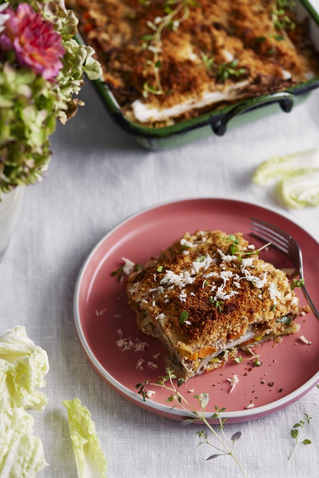 Butter zerlassen, Brösel u. Steirischen Kren g.g.A. mit Butter verrühren, Chinakohllasagne mit Masse bestreichen