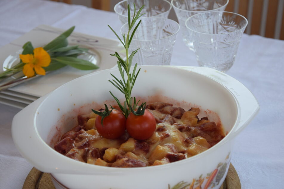 - Backofen auf 160°C vorheizen und eine Auflaufform mit 1 Teelöffel Öl einfetten. Zwiebel schälen, fein würfeln und in 2 Teelöffel Öl glasig dünsten. Rote Rüben und Erdäpfel dazugeben, mit Schlagobers auffüllen und kurz mitdünsten.